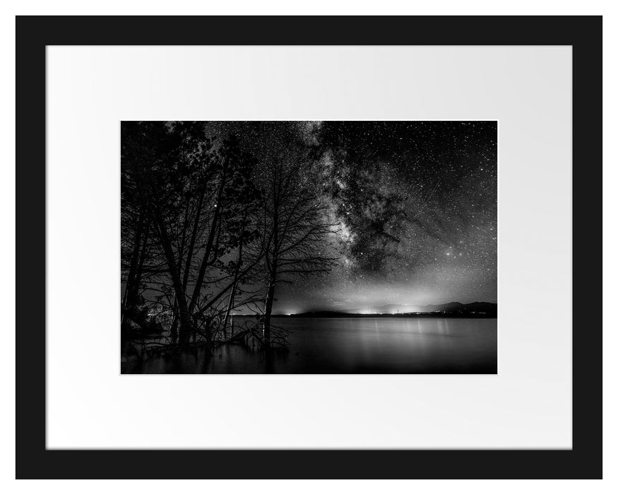 Produktcode: Bäume am See in sternenklarer Nacht, Monochrome, im Galerie-Passepartout Bilderrahmen