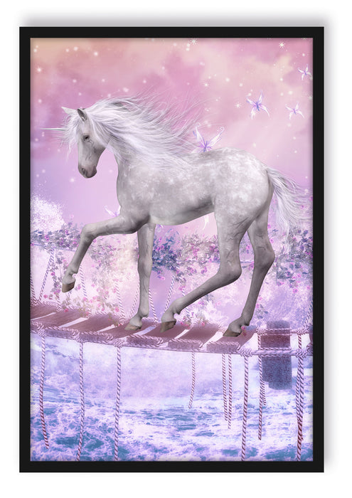 Produktcode: Einhorn läuft über Hängebrücke, Poster mit Bilderrahmen