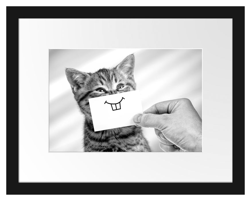 Produktnummer: Pixxprint Lustige Katze mit Lächeln auf Papier, Monochrome, im Galerie-Passepartout Bilderrahmen