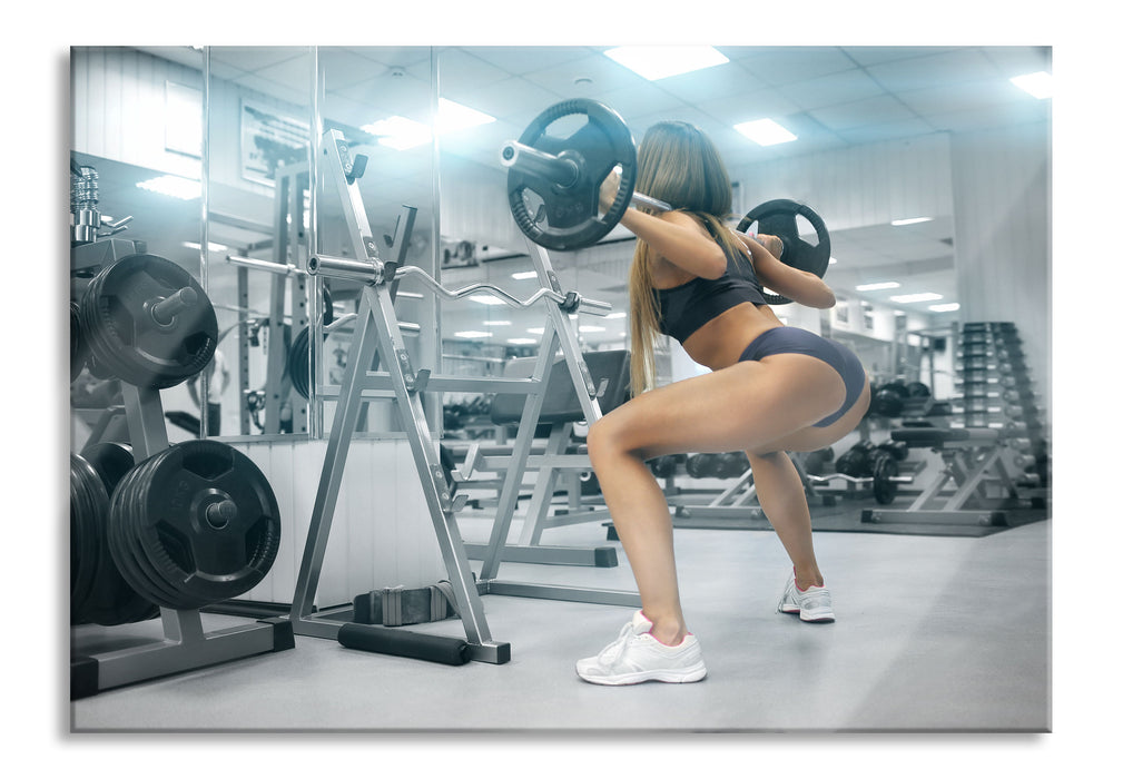 Produktcode: Sportliche Frau mit Hantelstange, Glasbild