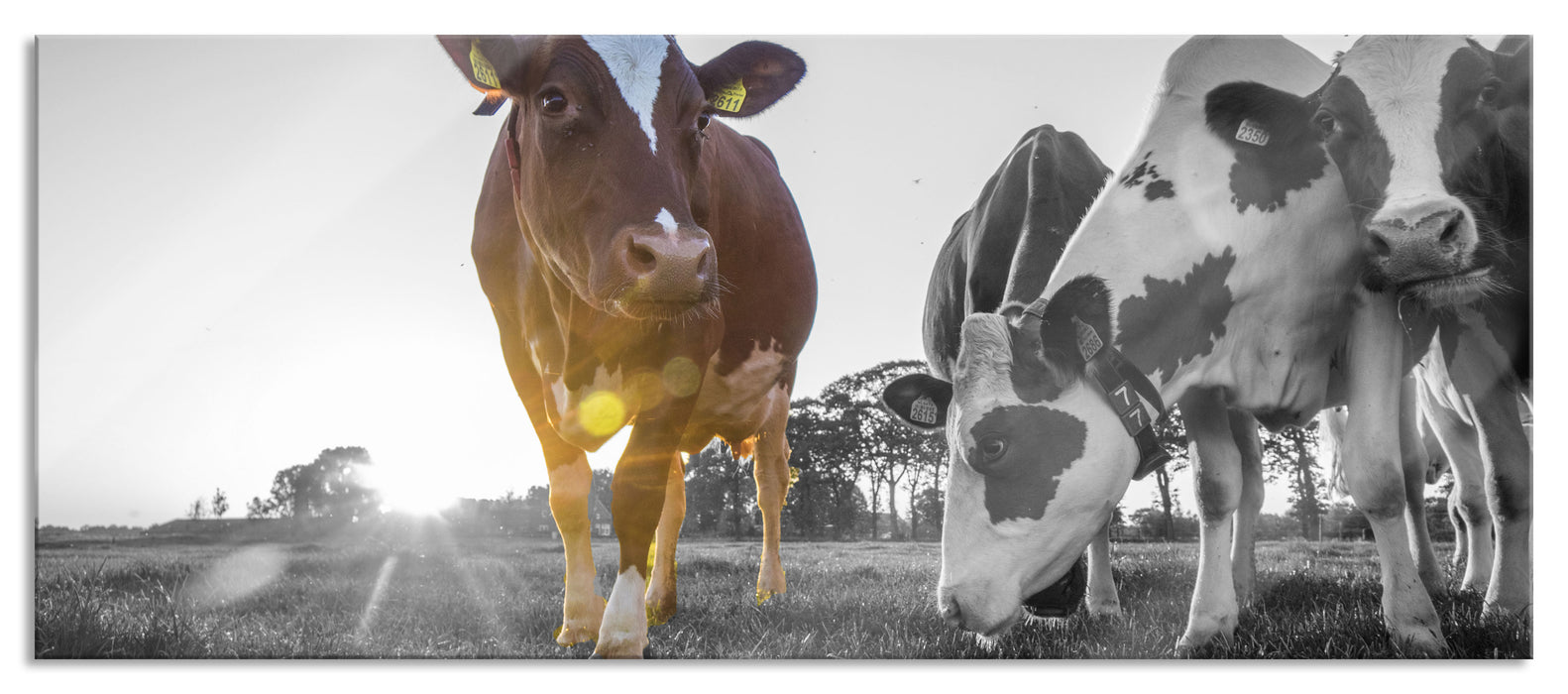 Produktcode: Kühe grasen auf Wiese bei Sonnenuntergang B&W Detail, Glasbild Panorama